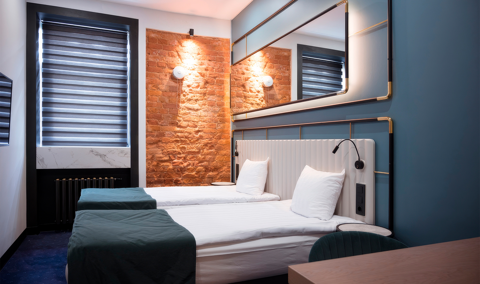 В номерах отеля — классический интерьер с лёгкими нотками лофта: кирпичные стены добавляют уюта.