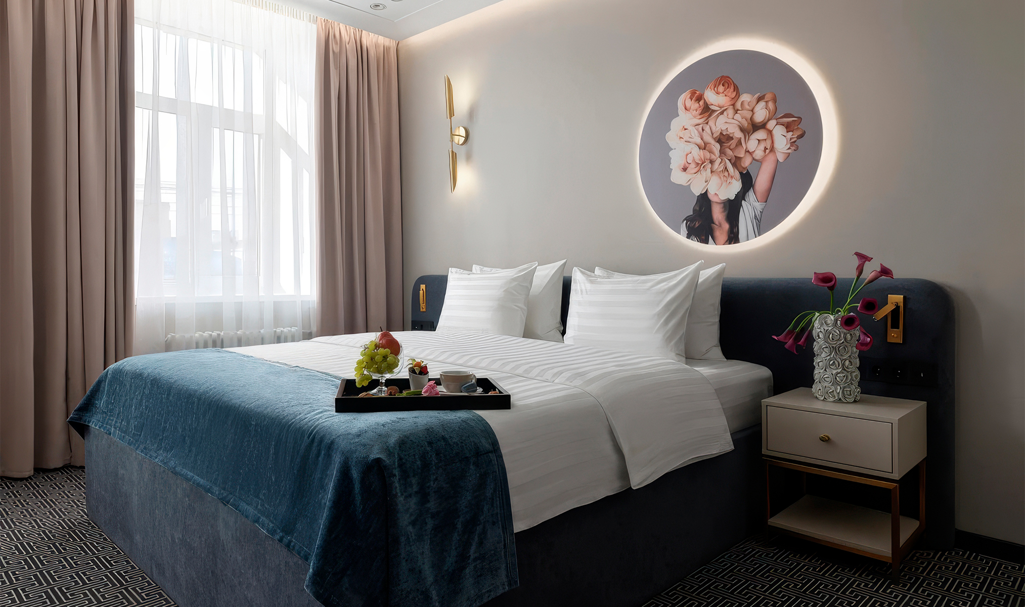 В номерах — стильный современный дизайн, подушки разной плотности и одеяла на выбор, чтобы отдых был максимально комфортным