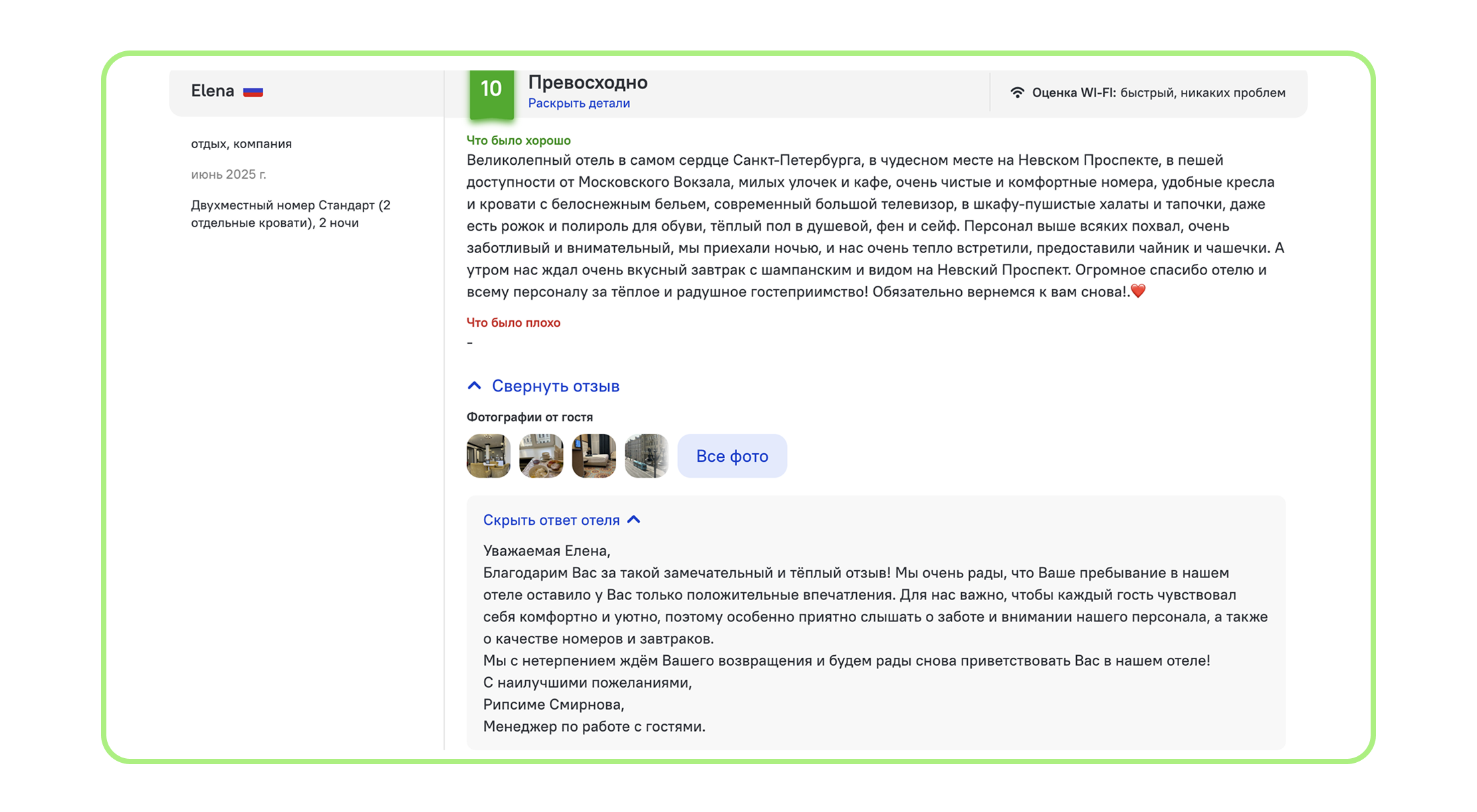 Гости пишут, что здесь гармонично сочетаются домашний уют и элегантность. В номерах предусмотрено несколько сценариев освещения, а на ресепшене можно взять зонты и сушилки для обуви. На завтраках подают шампанское, а закончившиеся блюда оперативно обновляют — никто не останется голодным.