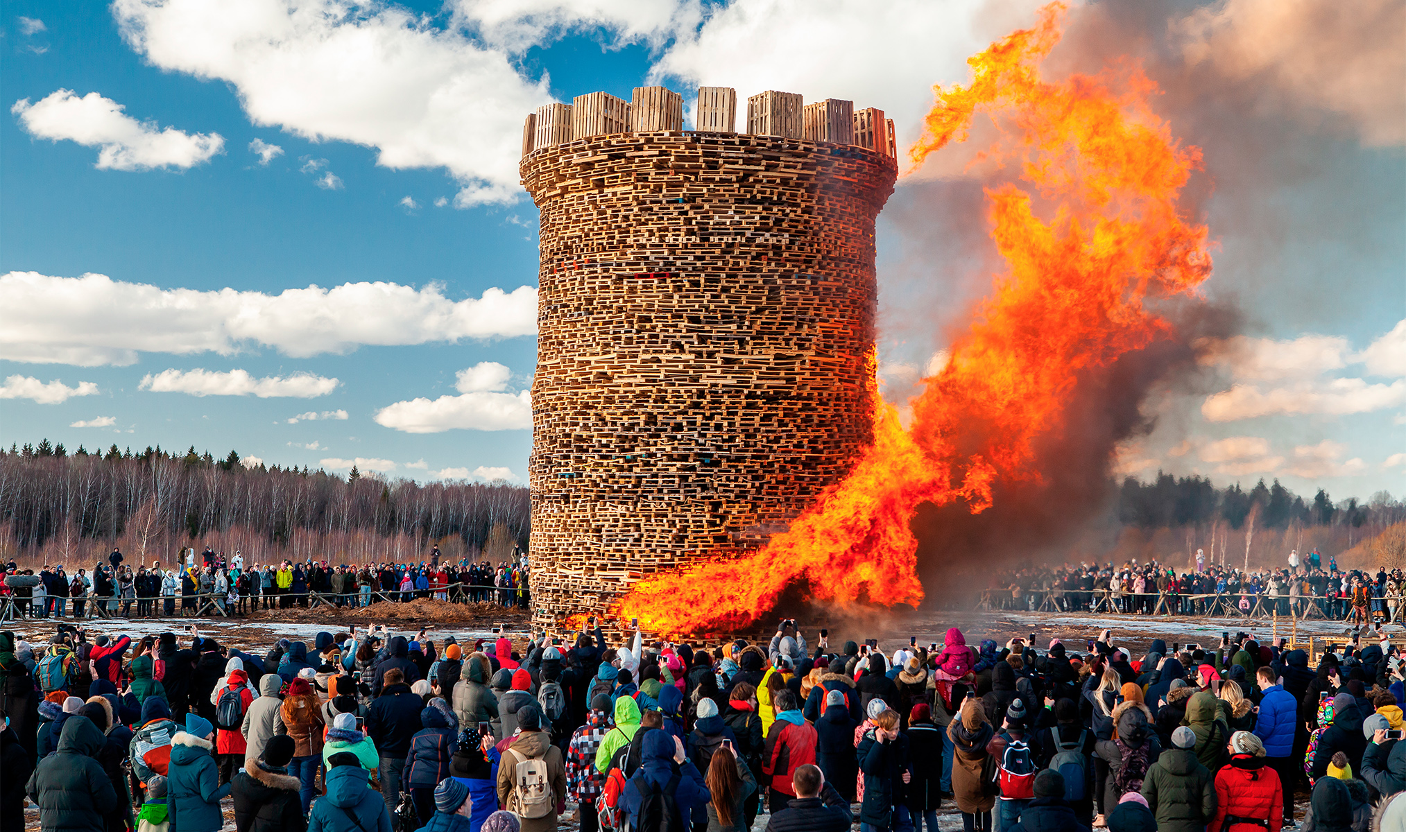 В Никола-Ленивце не просто сжигают обычное чучело, а устраивают настоящий перформанс с масштабным полыханием арт-объектов. Например, на одной из прошлых Маслениц огню предали башню высотой с семиэтажный дом. Зрелище, мягко говоря, впечатляющее!