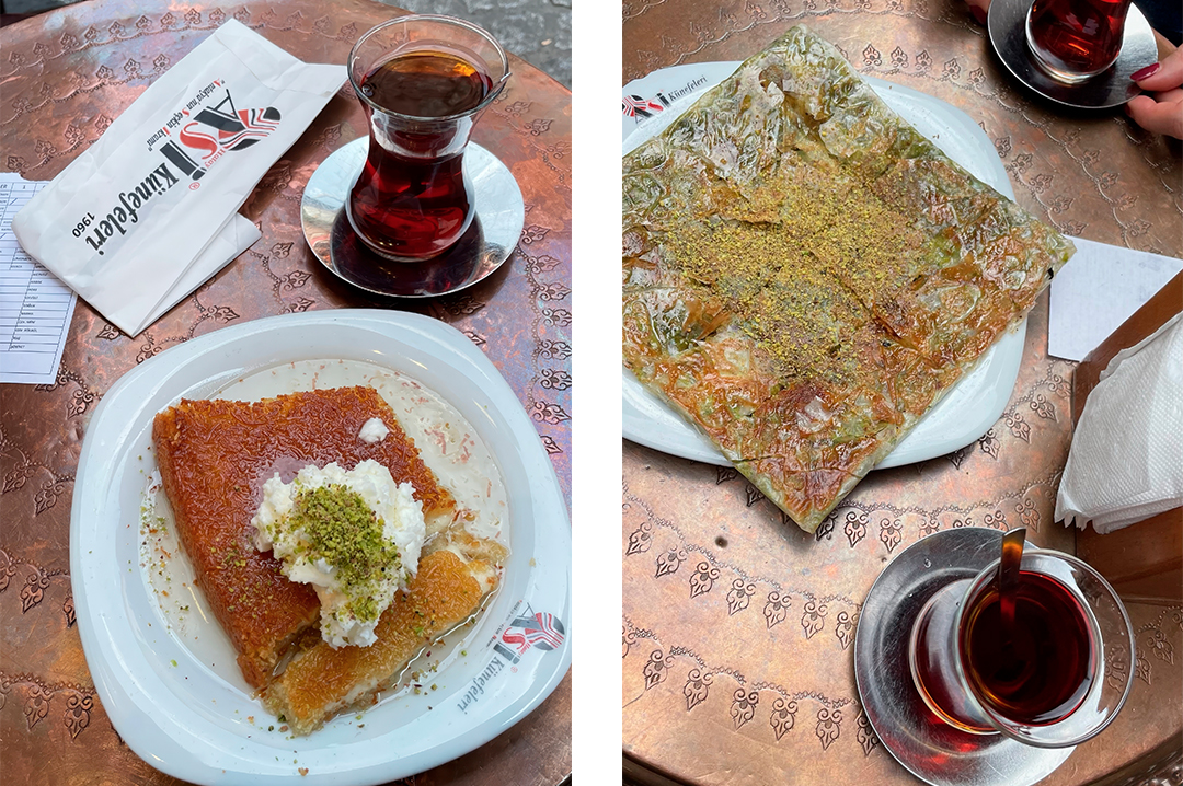 Однако я советую зайти в Hatay Asi Künefeleri, славящийся традиционным турецким интерьером. Поднимайся по узкой лестнице на последний этаж и занимай один из столиков у окна, чтобы увидеть «Гранд базар» с высоты. Заказывай кюнефе с пылу с жару и ещё один турецкий десерт, катмер: тонкое слоёное тесто с фисташками и жирными сливками. Очень сладко и вкусно!