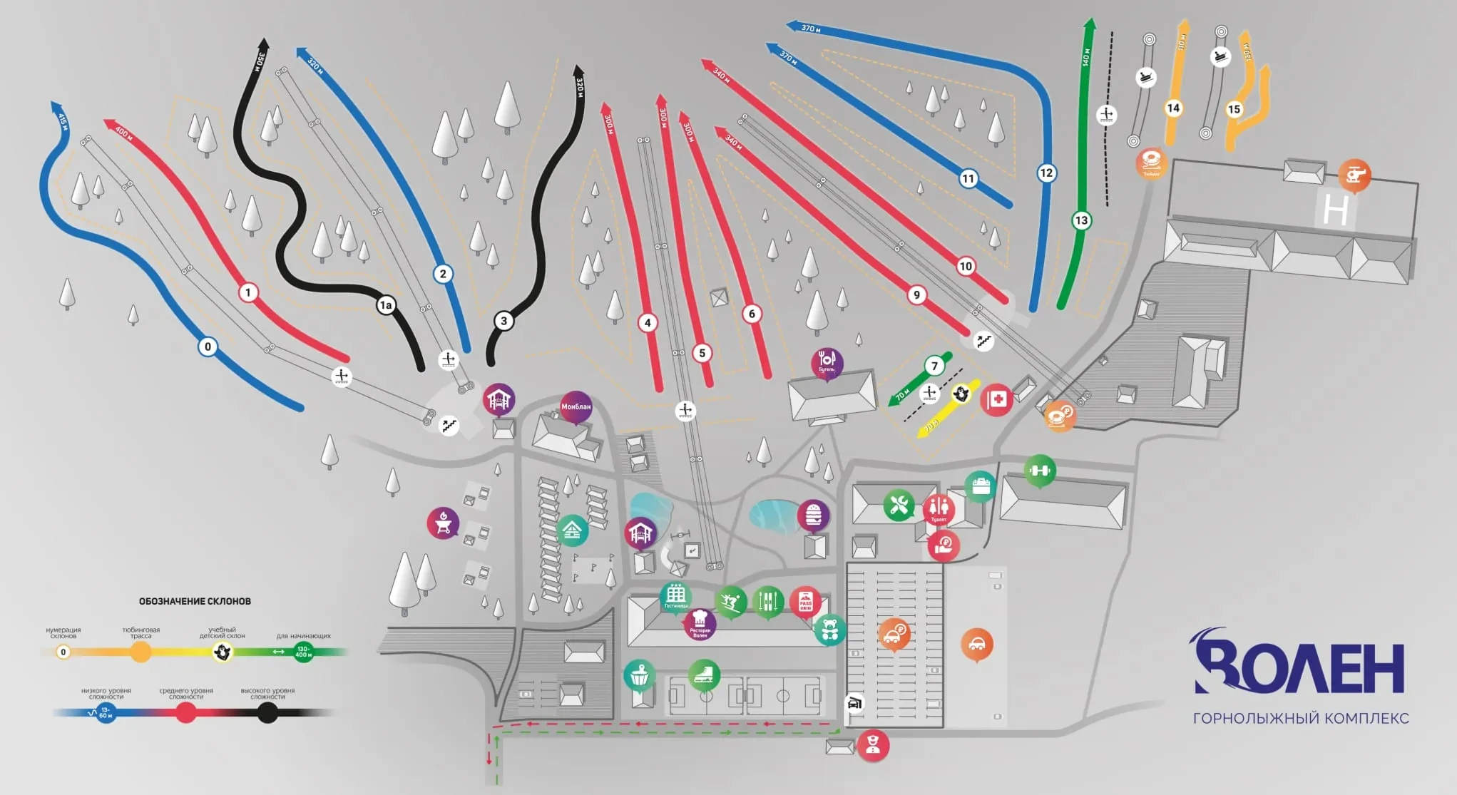 Трассы. В «Волене» 15 склонов, от учебных длиной 70 м до средних и сложных длиной 300–415 м, с перепадом высот до 60 м. Короткие прямые трассы идеальны для отработки базовых навыков катания. На карте есть манящий фрирайдеров лес, но заехать в него не получится, натянута сетка.