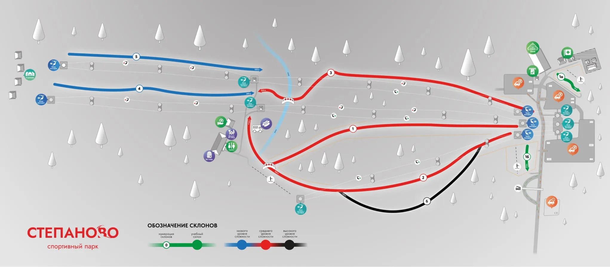 Трассы. В Степаново 8 склонов длиной до 960 м с перепадом высот до 110 м. Учебные трассы вынесены отдельно. Три промаркированы как «красные» и «чёрная».