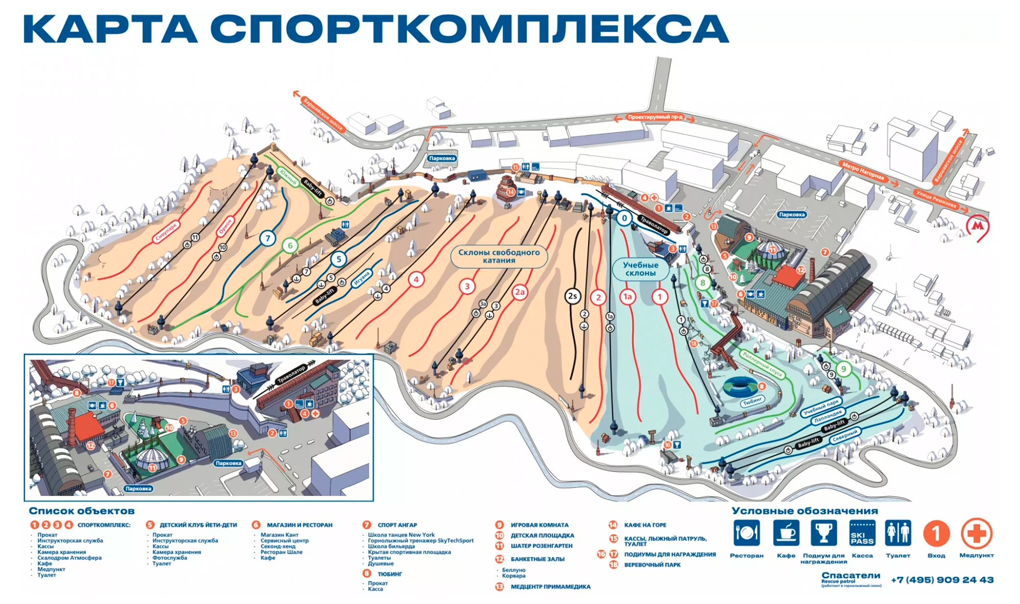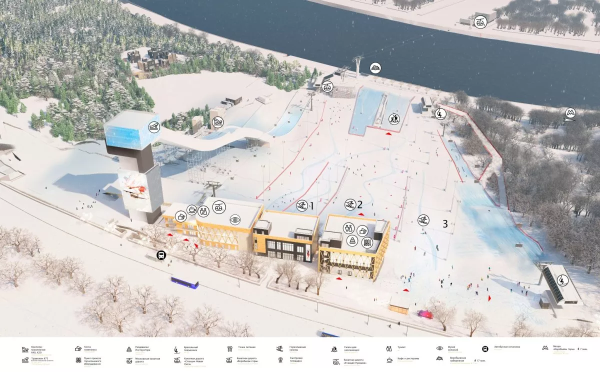 Трассы. Три основных склона длиной до 320 м с перепадом высот до 45 м и видом на башни Москва-Сити. Для начинающих есть учебная трасса протяжённостью 100 м, а для тех, кто учится выполнять трюки — сноупарк, отделённый от основной зоны катания.