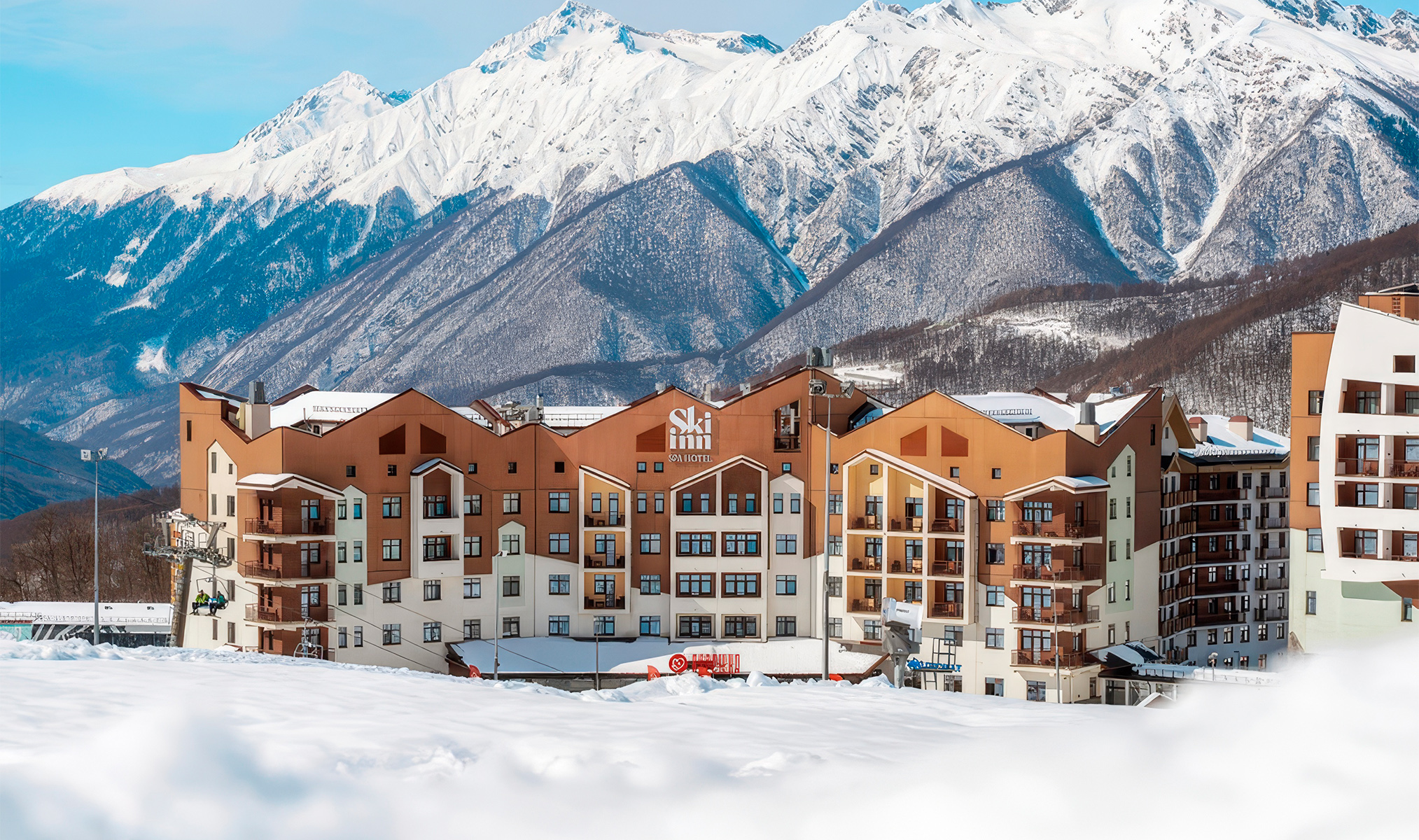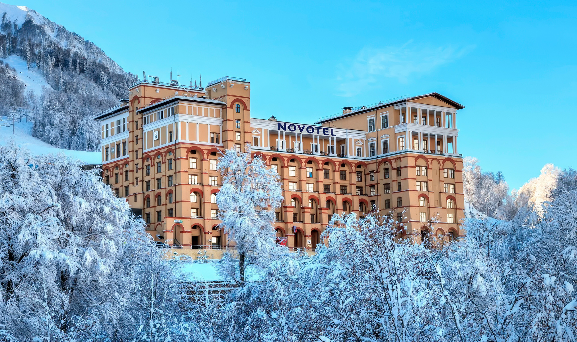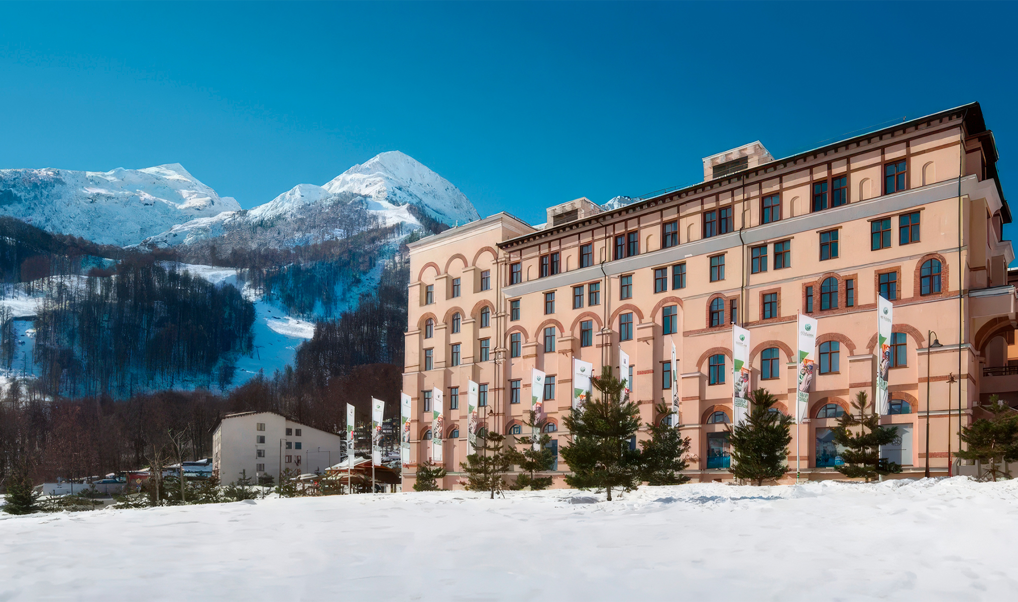 Четырёхзвёздочный отель в самом сердце Олимпийской деревни, рядом с канатной дорогой «Шале». И никаких утренних бессмысленных и беспощадных очередей на «Олимпию»! Для тех, кто с утра рвётся прямиком на пик, каждые 20 минут осуществляется бесплатный трансфер до подъёмника «Заповедный лес». Постояльцы признаются, что из окон отдельных номеров открывается «просто потрясающий вид» на горы, а из других видны подъёмники — можно визуально оценить, работают ли они.