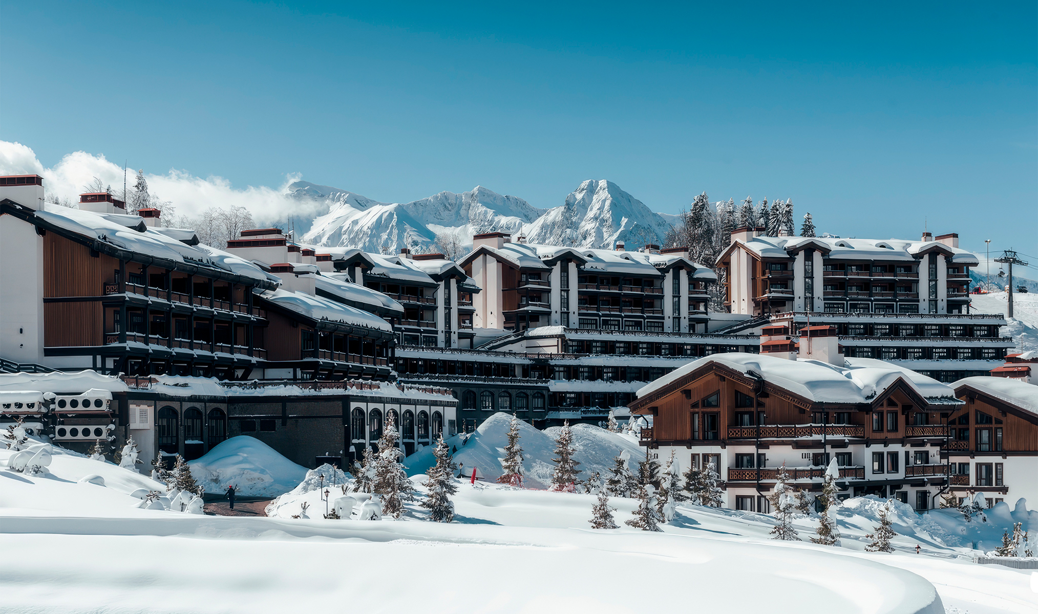 Сетевой пятизвёздочный отель на Поляне 960, в паре минут ходьбы от подъёмников «Снежная звезда», «Реликтовый лес» и «Восточный лес». Гости с удовольствием отмечают, что благодаря расположению они «всегда первые на склоне не в ущерб сну». Даже шикарный завтрак в панорамном ресторане не приходится вычёркивать ради вельвета — редкое удовольствие. А ещё формат Ski-in / Ski-out позволяет днём сделать паузу и быстро вернуться на уютную веранду отеля за глинтвейном.