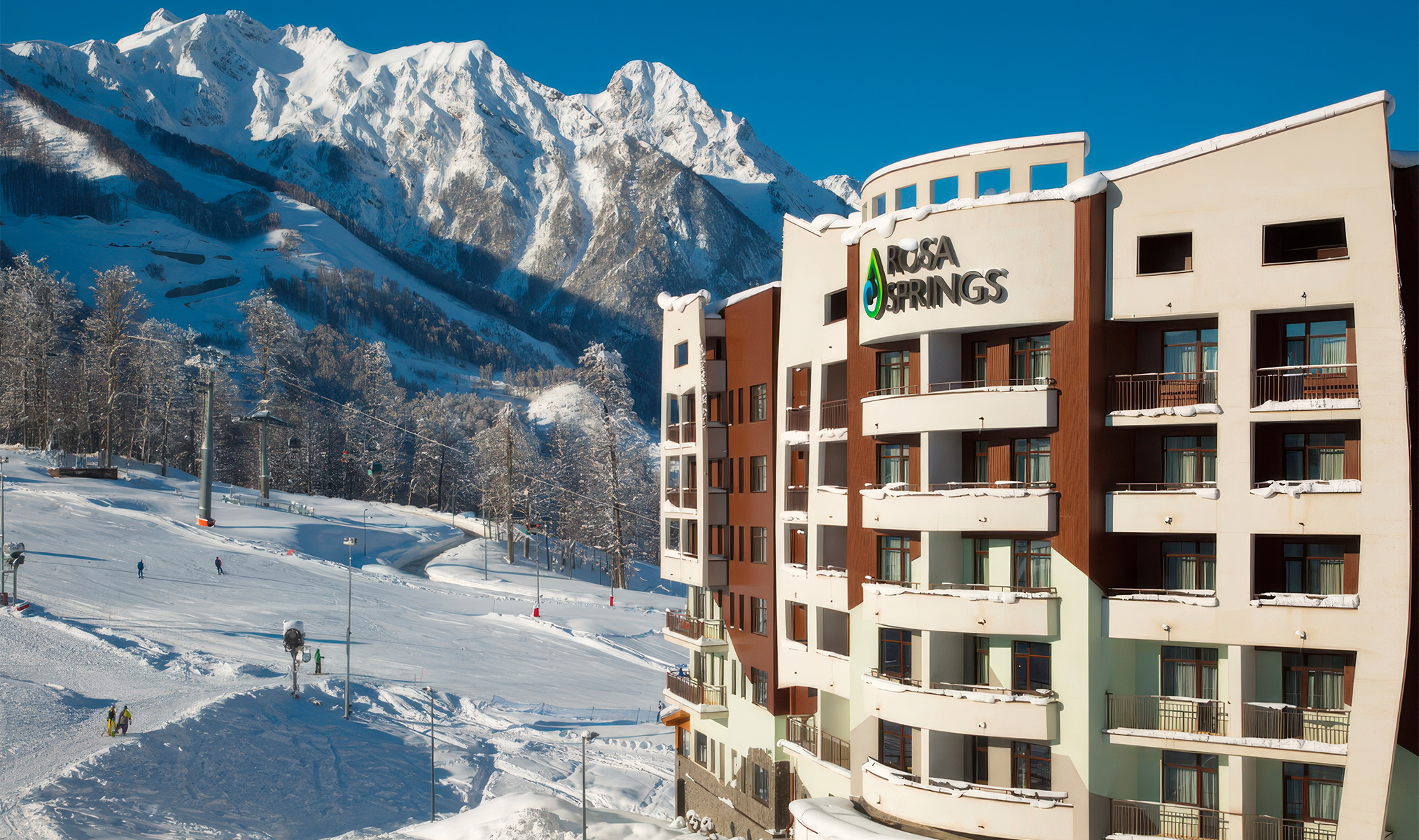 Завершает подборку пятизвёздочный отель-санаторий. Будем откровенны: у кого из горнолыжников периодически не ноет спина и не поскрипывают колени? Для таких случаев Rosa Springs — самый подходящий вариант. Подъёмники «Шале» и «Заповедный лес» находятся в шаговой доступности, а выйти к ним можно прямо из лыжной комнаты — и первым оказаться на вельвете. На ресепшене продают ски-пассы — можно сразу идти на склон восстанавливать ментальное здоровье.