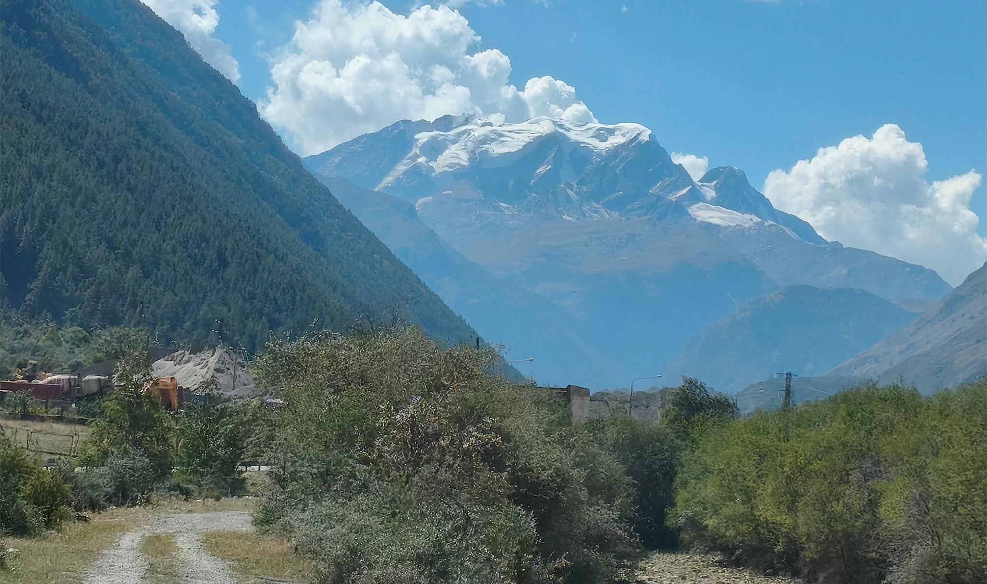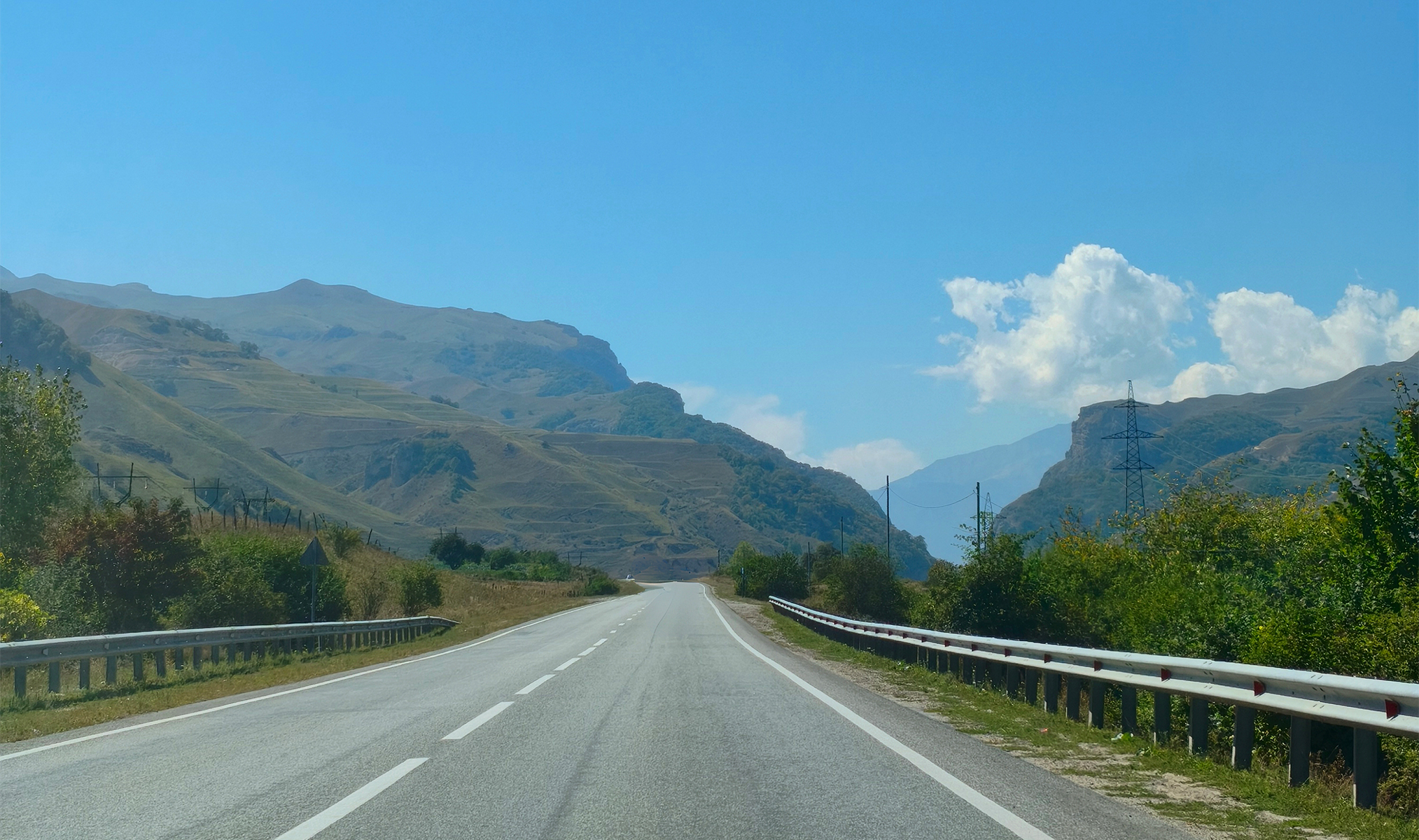 При очередной заправке машины местные жители стояли и любовались видом издалека на гору Эльбрус. В тот самый момент мы впервые его увидели вживую — серебристые вершины и безоблачное небо, сердце забилось сильнее.