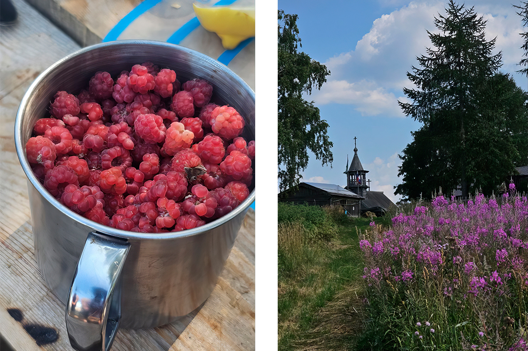 Из-за жаркой погоды грибов мы не встретили, черника была некрупной, но малины в этом году нам насыпали от души. Её мы собирали рядом с заброшенными деревнями, часовнями, зарослями иван-чая, это было так вкусно, что даже крапива не могла остановить нас.