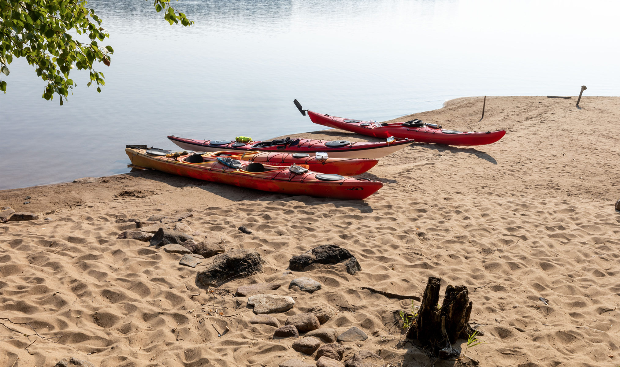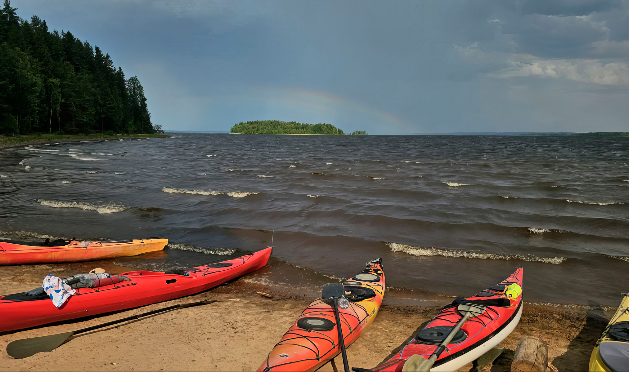 Средняя глубина Водлозера — около четырёх метров, и, пожалуй, это основная причина, почему наш выбор пал именно на него. Среди участников нашего путешествия были те, кто в этом году впервые сел в каяк, к тому же даже при наличии всего снаряжения и некоторого опыта нештатные ситуации не исключены. Тёплая вода и мелководье должны были подстраховать нас при возможных ошибках в планировании и управлении лодками.