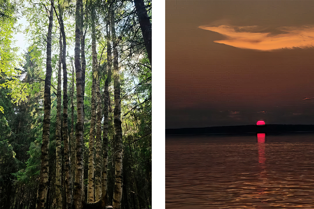 Берёза «Двенадцать апостолов» и закат на воде рядом с монастырём.