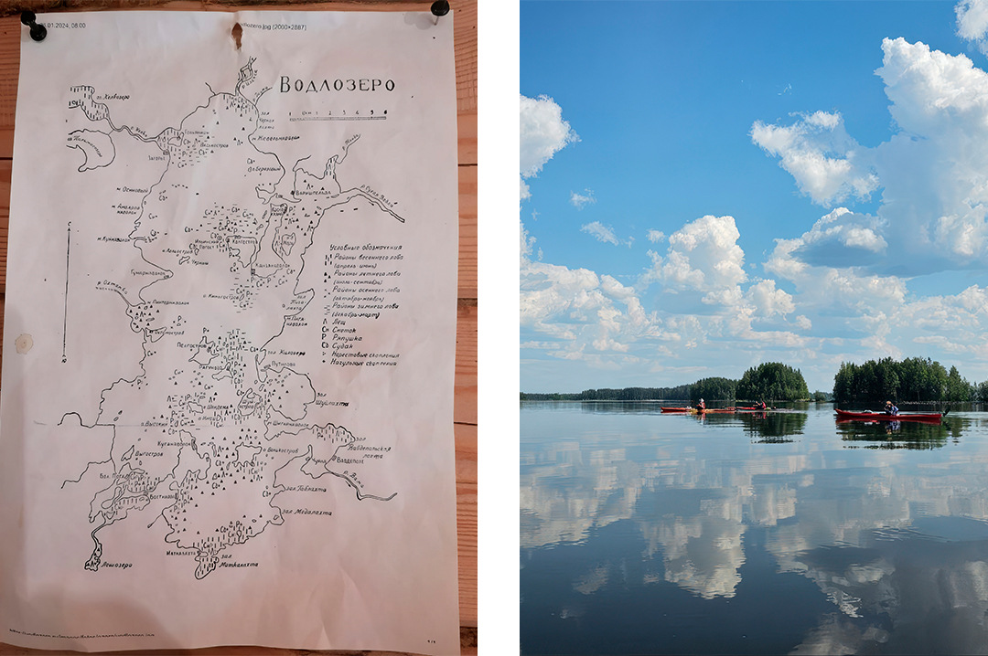 Слева — карта рыбных мест Водлозера. Справа — водная гладь и наша компания каякеров.