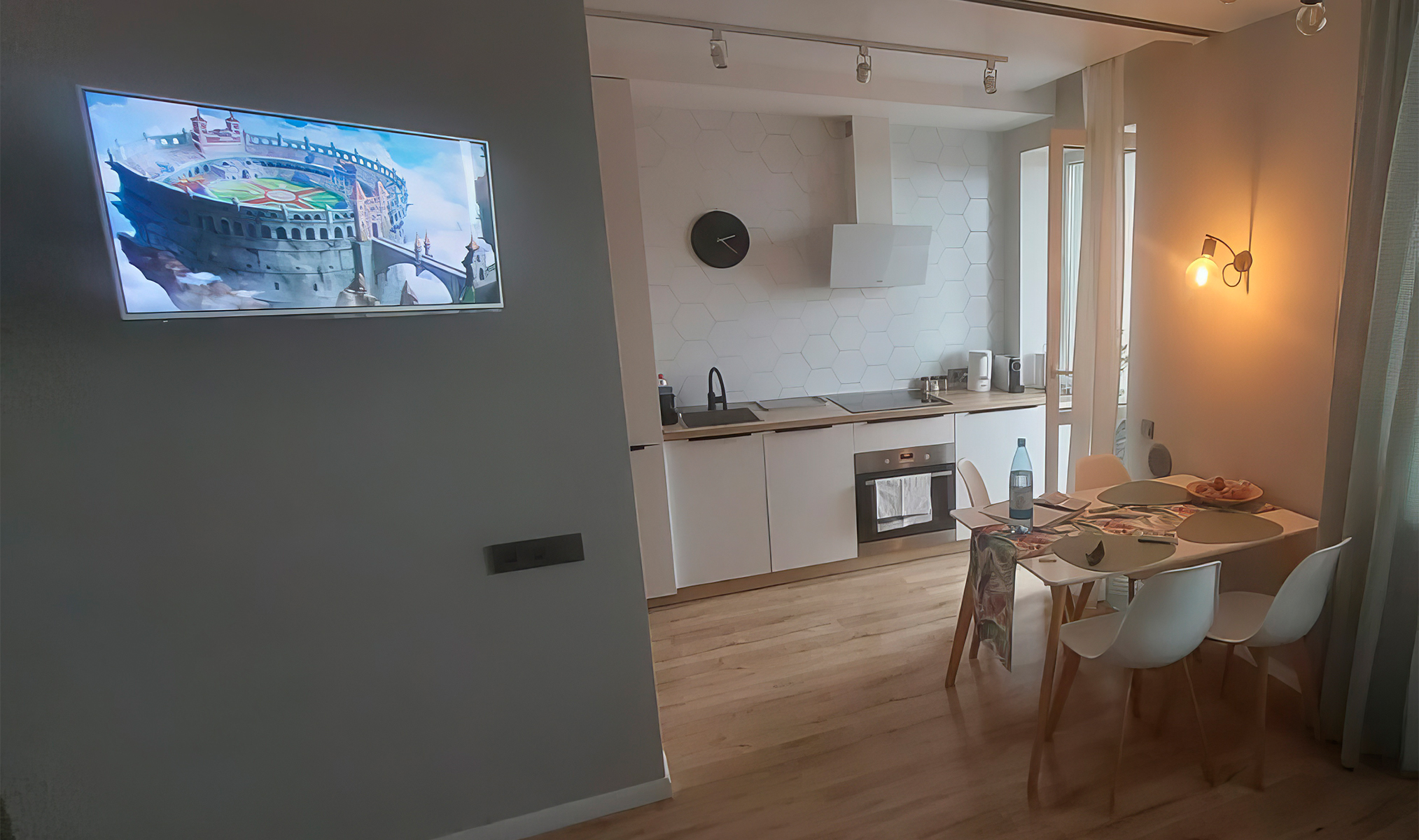 Заселение было бесконтактное, вся коммуникация — через мессенджеры. Квартира, помимо идеальной чистоты и отличного состояния мебели, встретила нас ещё и приятными бонусами: зонтиками от дождя, компактными пляжными полотенцами и пляжным зонтом, а ещё комплиментом в форме тарелки с кексами на обеденном столе. Управляющая апартаментами всегда была на связи и несколько раз сама интересовалась, всё ли у нас хорошо.