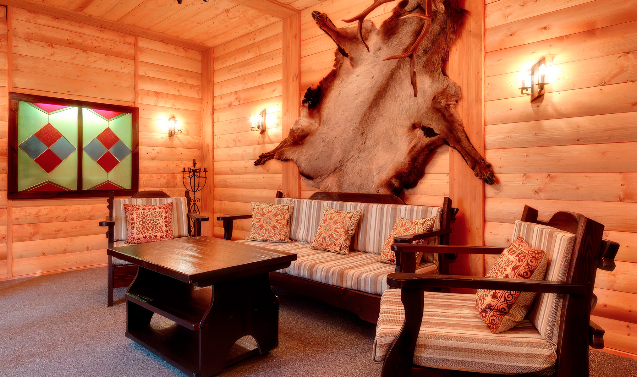 Отель стилизован под русскую старину: в интерьере присутствует тематика русских богатырей.