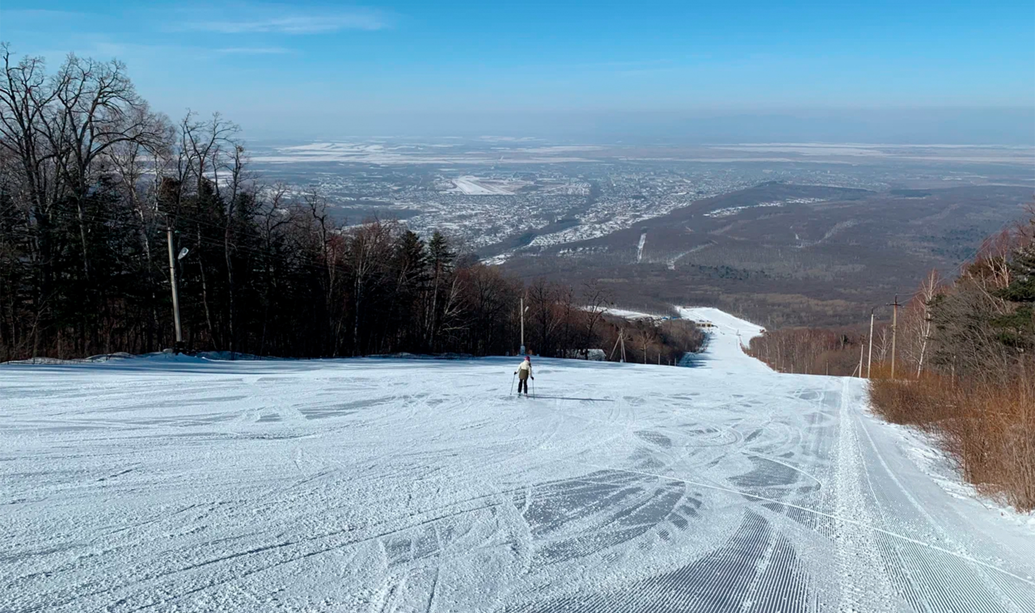 Инфраструктура. На вершину поднимает четырёхместная креселка с подогревом сидений и колпаками. Установлены снеговые пушки, так что ждать снегопадов не обязательно. Работают пункт проката и служба инструкторов, есть парковка и кафе. Пока стационарного здания для переодевания нет, приходится обходиться обогреваемыми палатками. В общем, будешь зимой в Хабаровске — заглядывай проветриться! Дата открытия сезона в 2025 году — пока интрига, следи за новостями.