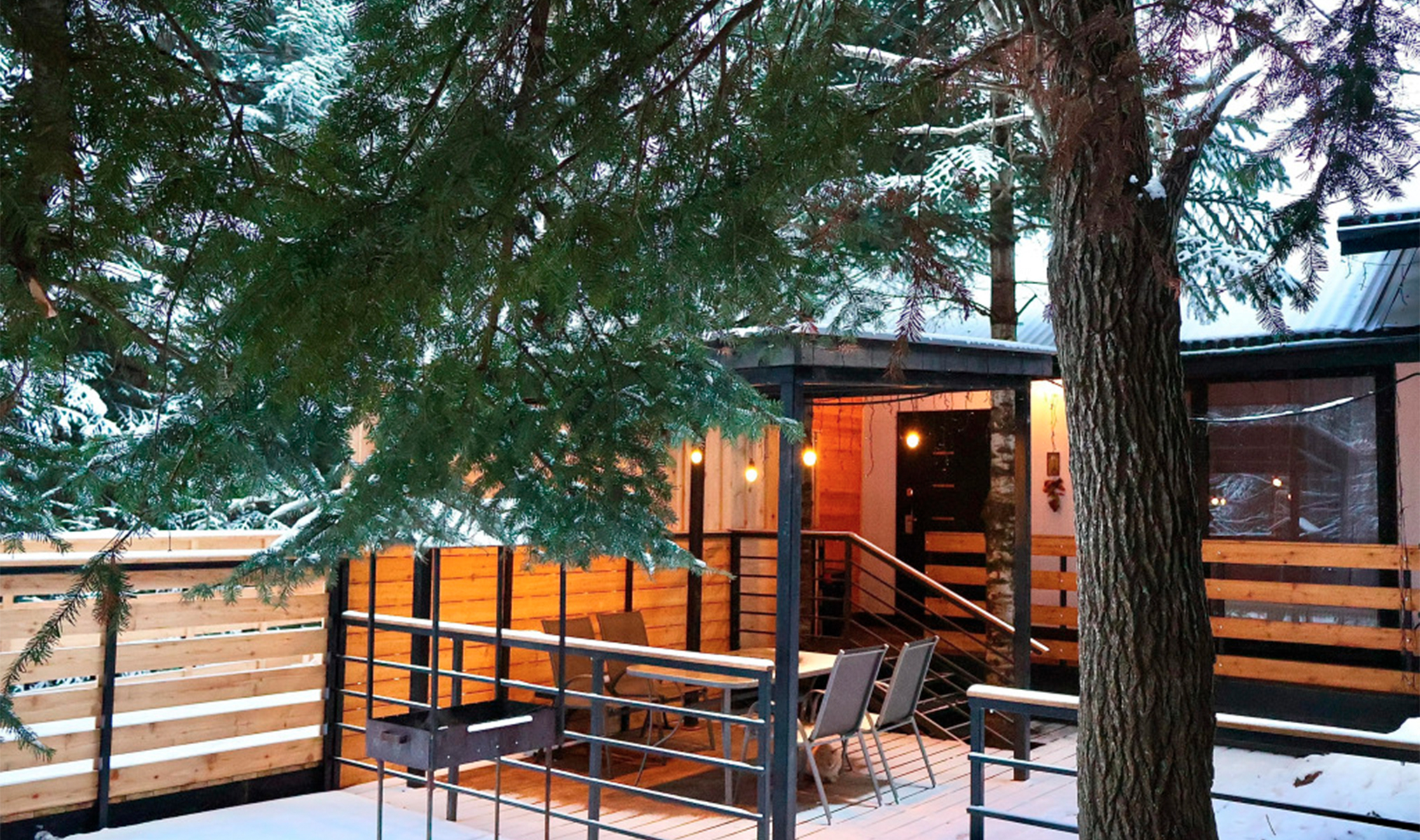 - Обычно есть свой двор, где можно поиграть в снежки, посидеть у костра или погреться в горячем чане без посторонних взглядов. А ещё иногда можно нарядить живую ель прямо рядом с домом.