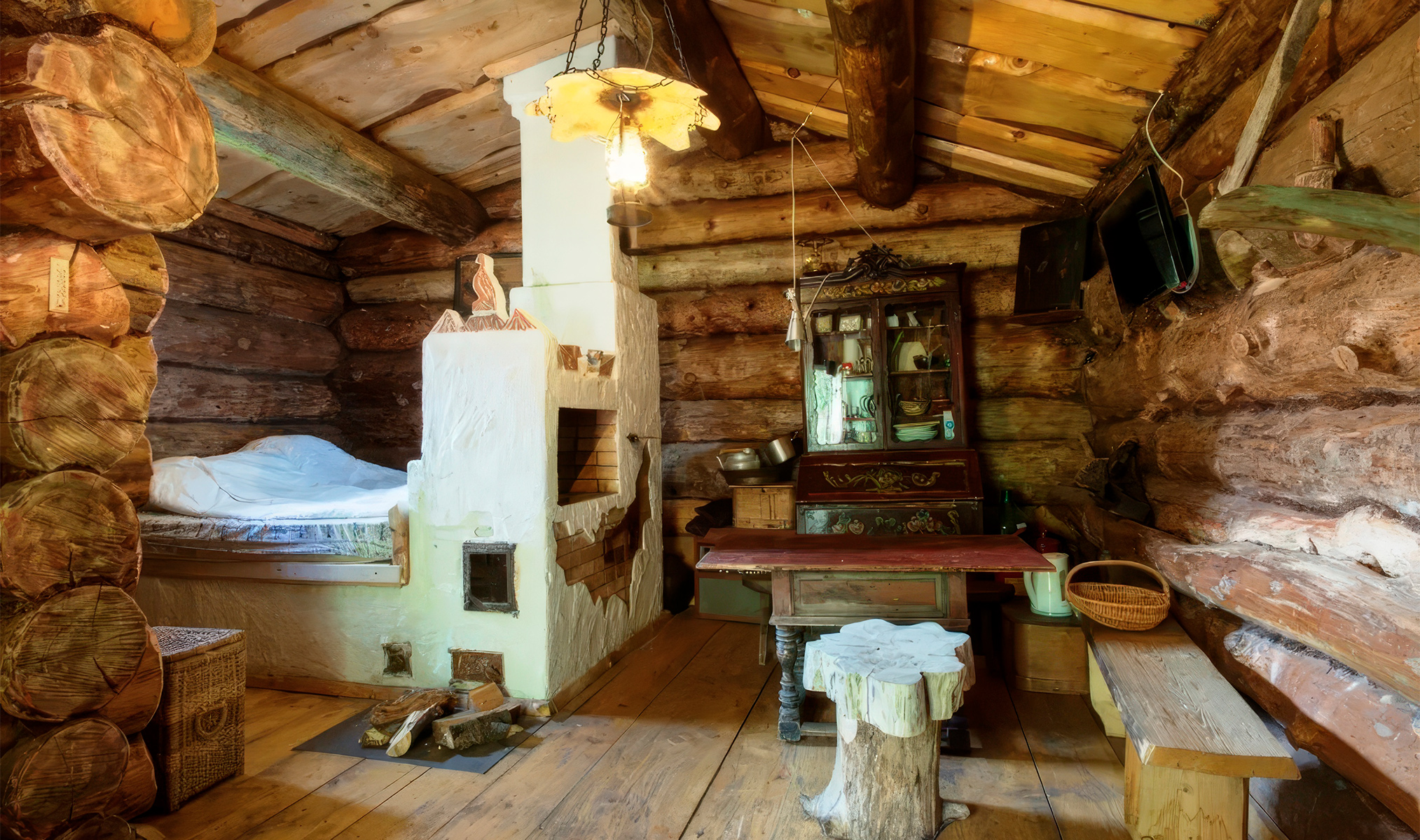 В подмосковном лесу есть арт-усадьба «Веретьево» с таёжными домиками с печками.