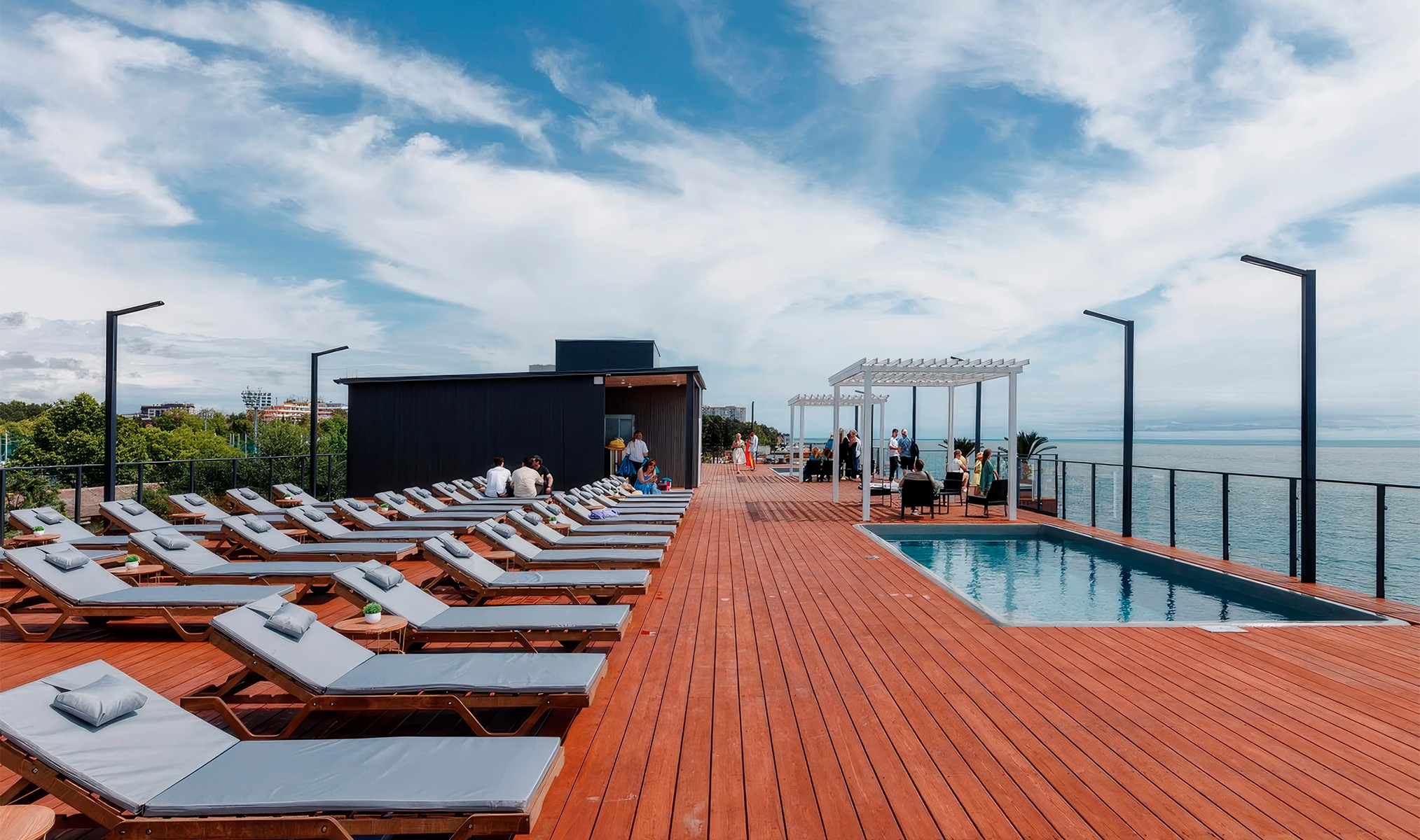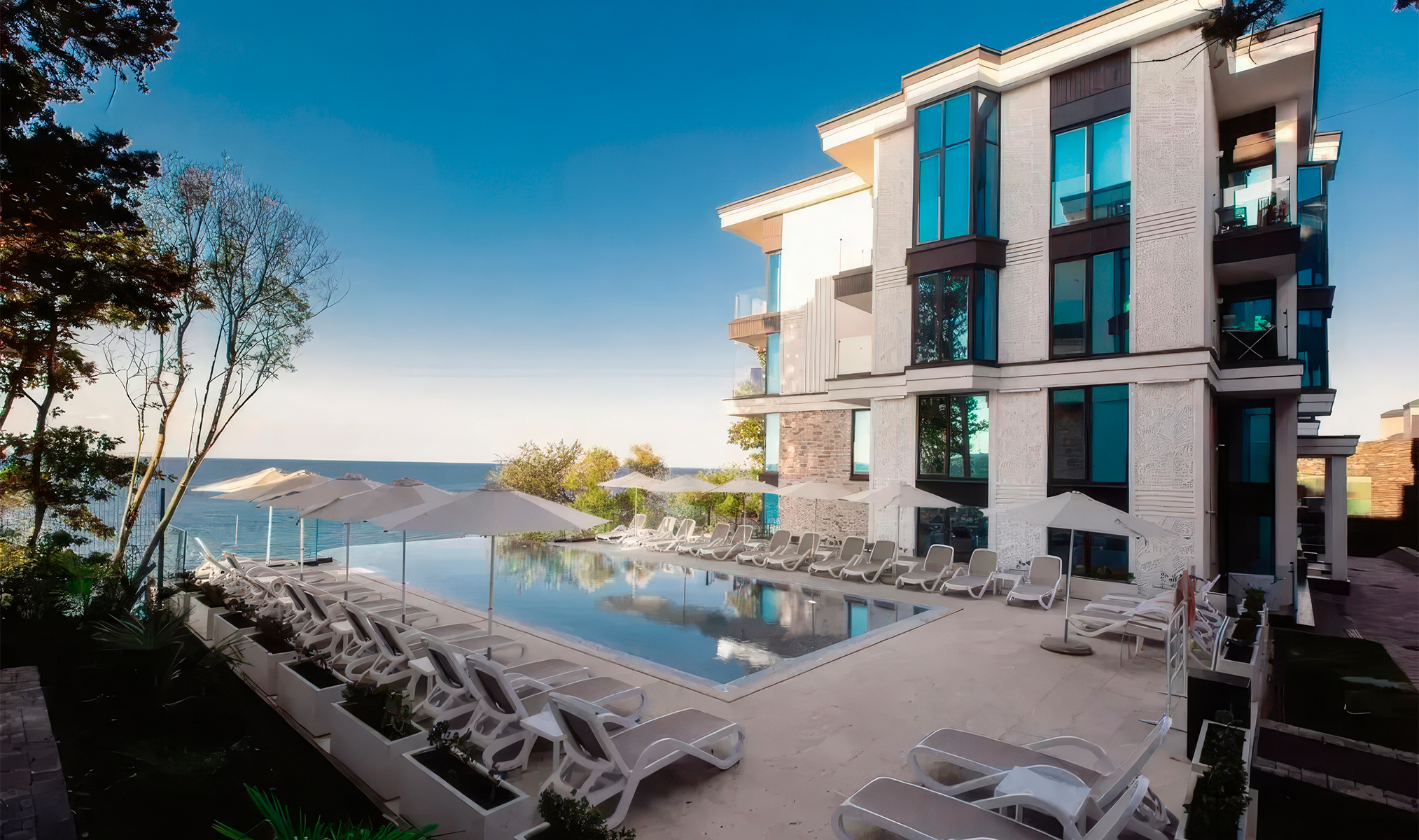 Для отдыха есть всё нужное: ресторан, собственный пляж, обычный и инфинити бассейны, игровые площадки и панорамные виды на море.