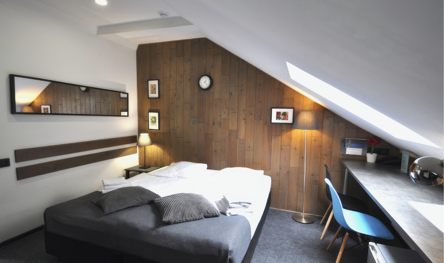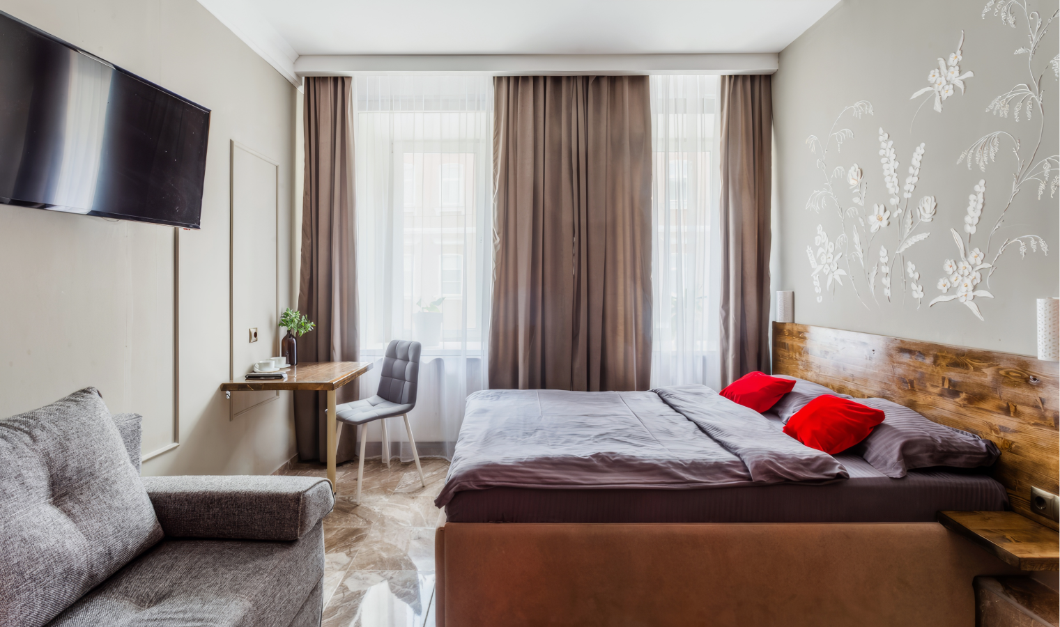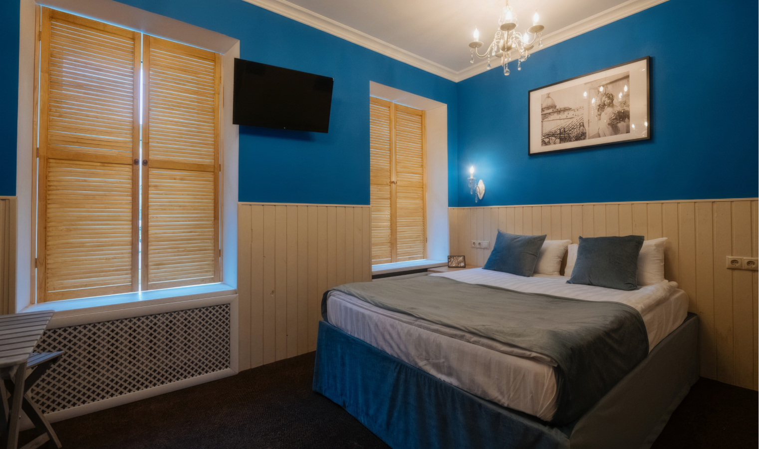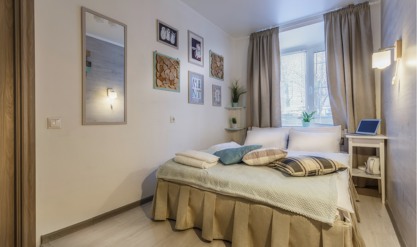 Небольшой отель в тихом дворе с компактными номерами и светлым интерьером. Атмосферу домашнего уюта создают картины, мягкие пледы, настенные часы и яркие подушки. Отличный вариант для соло-путешественников или тех, кто ищет место только для ночёвки.