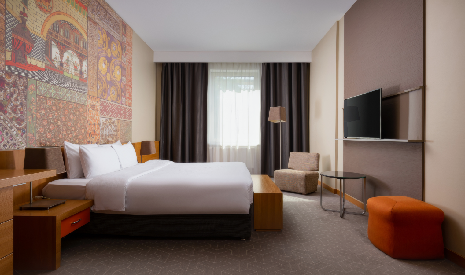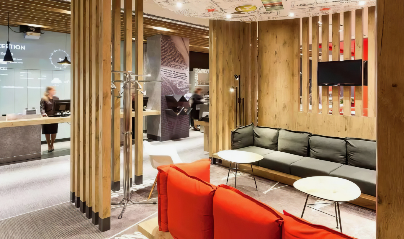 Интерьеры выдержаны в классическом стиле, а лобби традиционно для сети оформлено яркими акцентами и элементами под дерево.