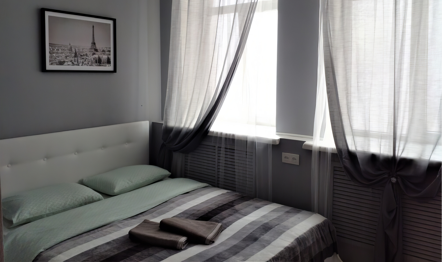 Среди вариантов — апартаменты с собственной кухней, расширенные семейные номера с несколькими кроватями, а также эконом с общей ванной комнатой.