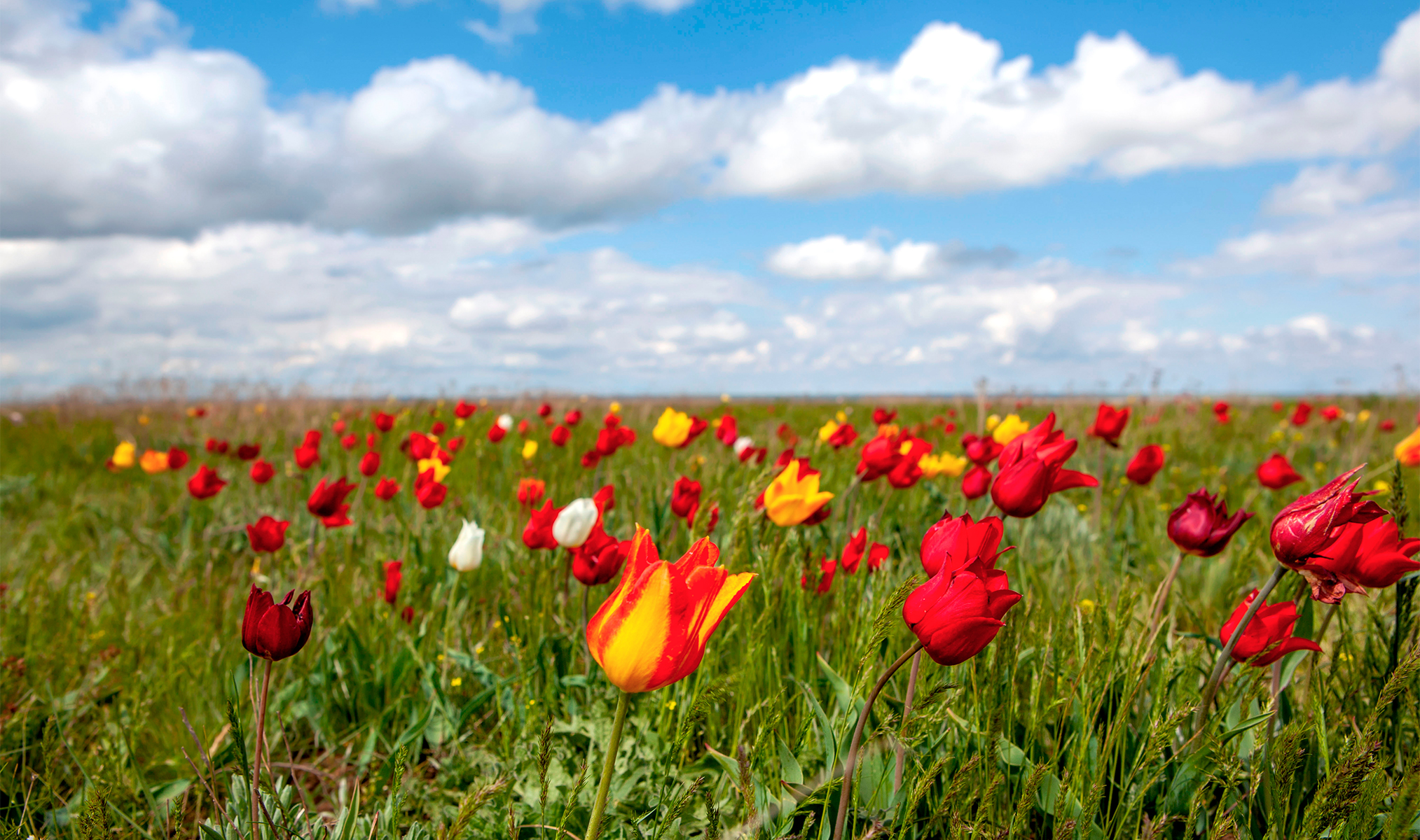 Красные и жёлтые дикие тюльпаны Шренка тянутся до самого горизонта. Фото: Sergei Afanasev / Shutterstock.com