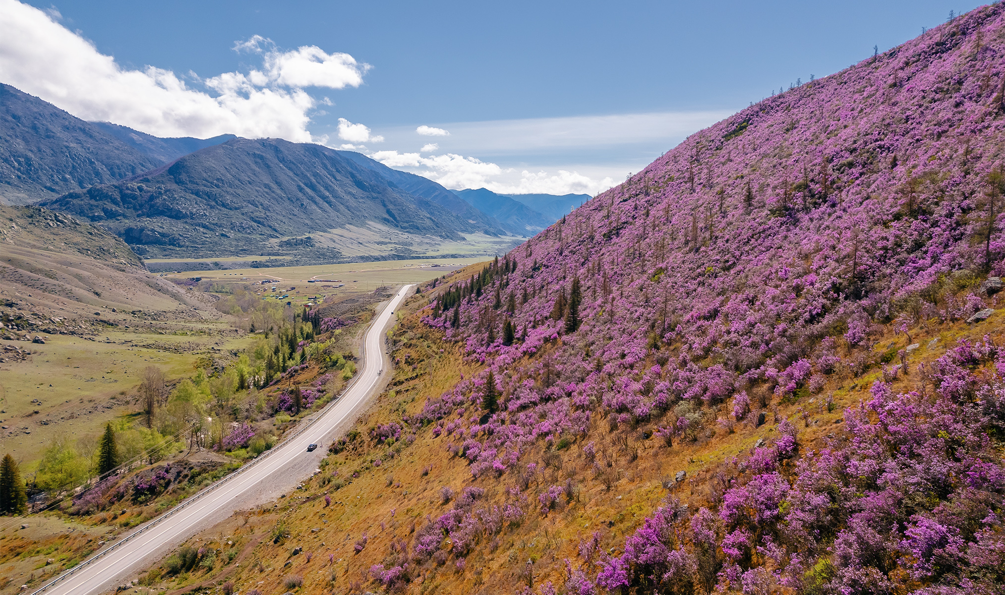 Каждую весну в горах Алтая случается чудо — склоны окрашиваются в нежно-розовые и сиреневые оттенки. Фото: Parilov / Shutterstock.com