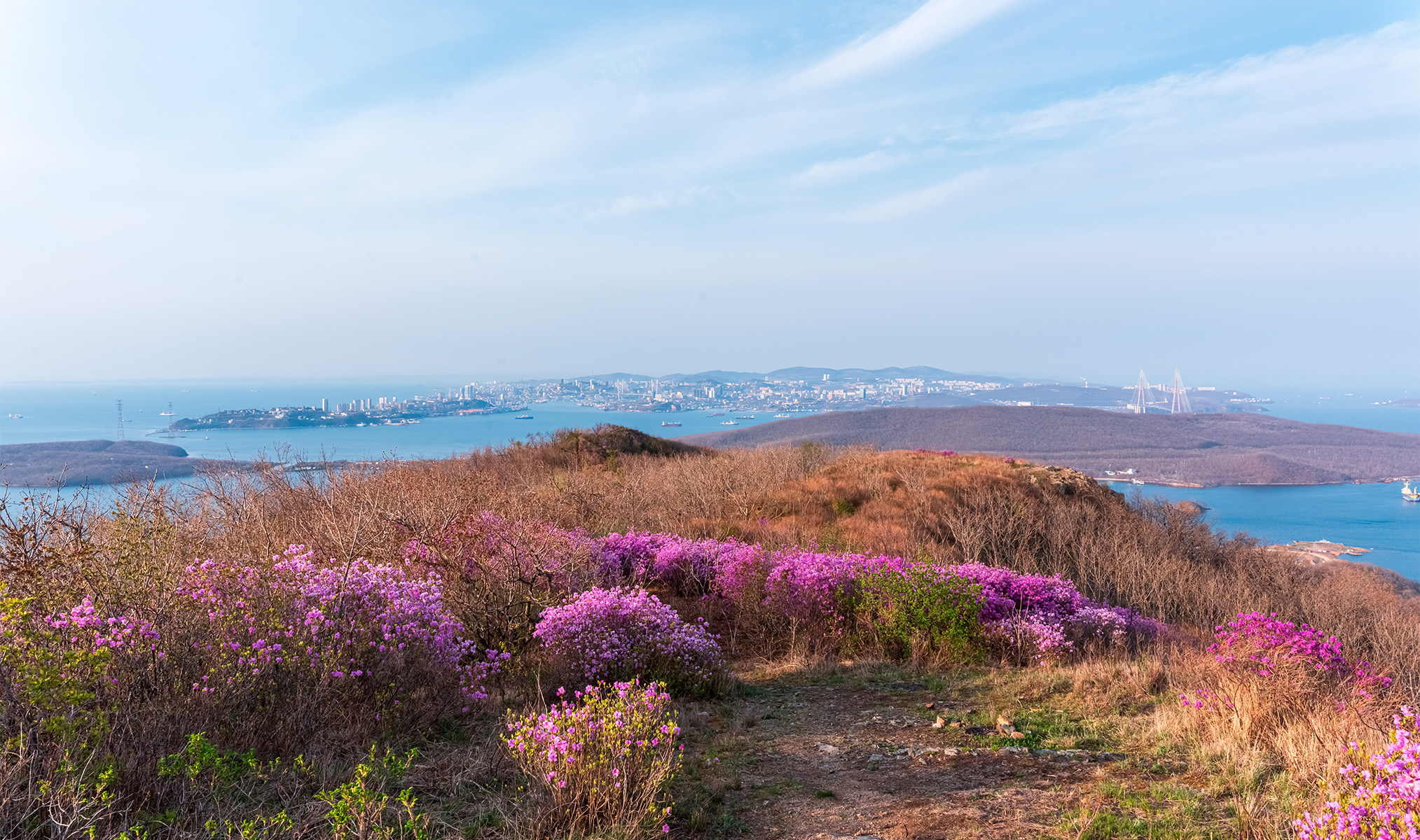 В конце апреля — начале мая, когда только сходит снег, Владивосток словно укутывается розовым одеялом. Это зацветает приморская сакура— так здесь называют рододендрон остроконечный, в изобилии растущий на окрестных сопках и скалистых берегах острова Русский. Нежные цветы на фоне голубого моря — весомый повод рвануть в майское Приморье.
