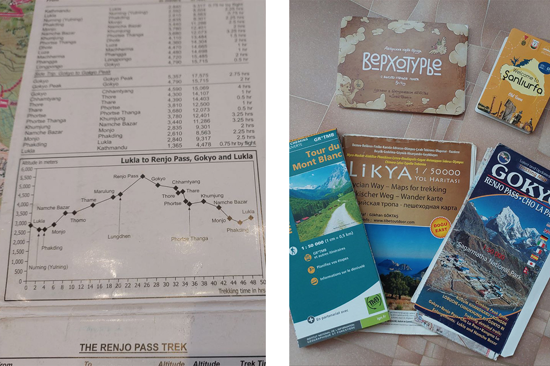 Подробные бумажные карты — мастхэв в трекингах, например в Гималаях, Альпах или на Ликийской тропе. Карты отдельных маршрутов обычно включают перепад высот — ключевую информацию для горных походов — и среднее время в пути между точками. Их можно найти в книжных и сувенирных магазинах, а также в инфоцентрах и местах оформления разрешительных документов.