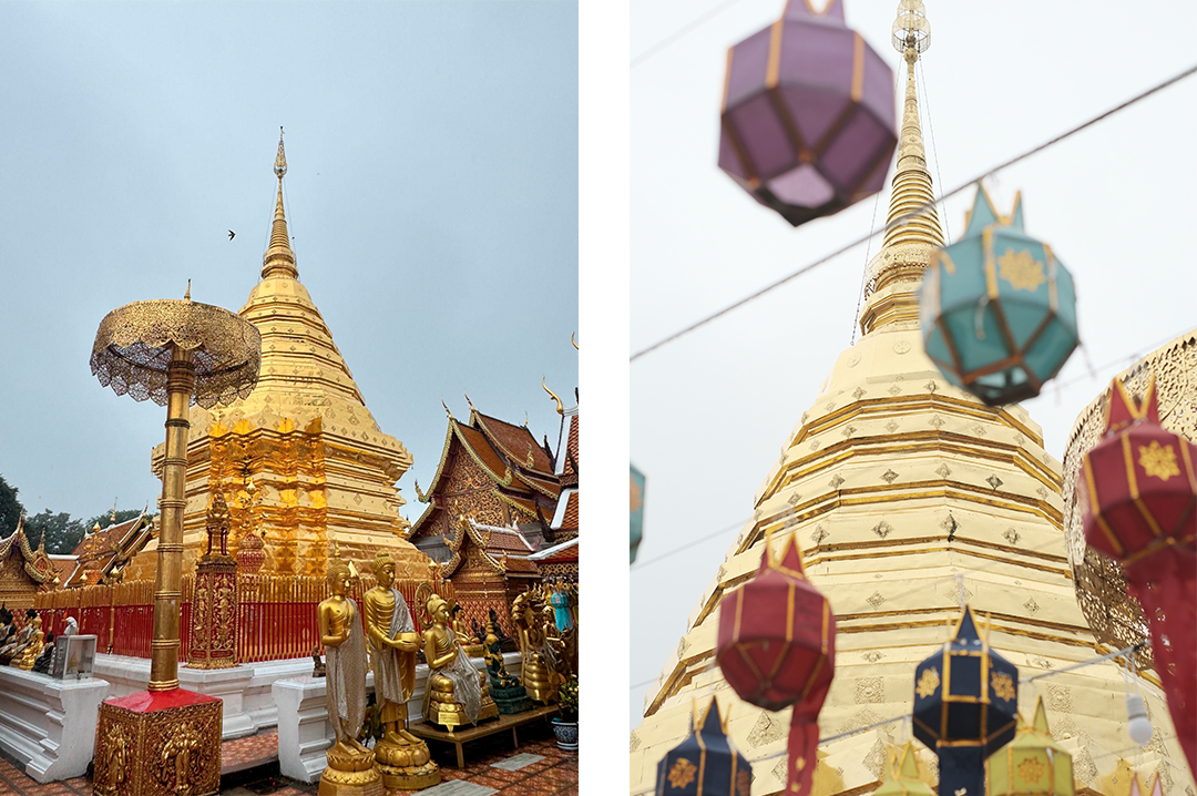 Священный храм на вершине горы Дой Сутхеп, на высоте около 1000 метров над уровнем моря. Здесь монах читает напутствие на счастье, здоровье и удачу, а затем повязывает браслет из 28 белых нитей, который принято носить, не снимая.