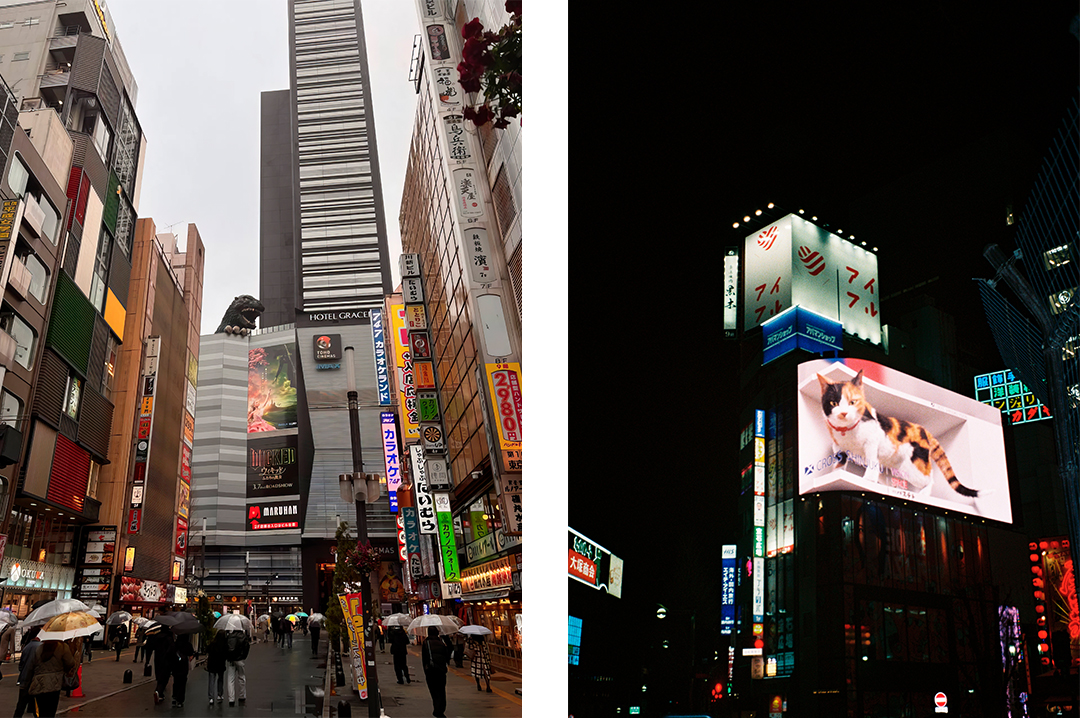 Ещё в Синдзюку можно встретить отель с Годзиллой и котика с 3D-рекламы. Фото: Михаил Кашляк