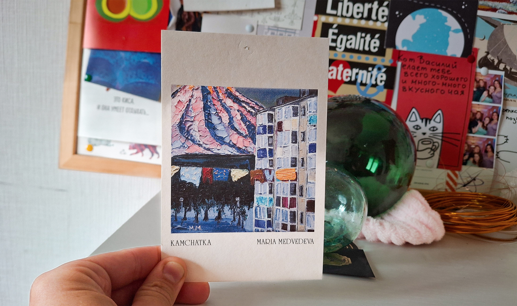 Фотографии и открытки с далёкой Камчатки — ещё один приятный подарок. Подпиши открытку, например, стоя у кратера вулкана, оставь дату и время — такое точно не забудешь! Сегодня мастера рисуют авторские и уникальные открытки: например, местные пятиэтажки маслом от Марии Медведевой — сразу веет спокойствием и уютом Петропавловска-Камчатского.