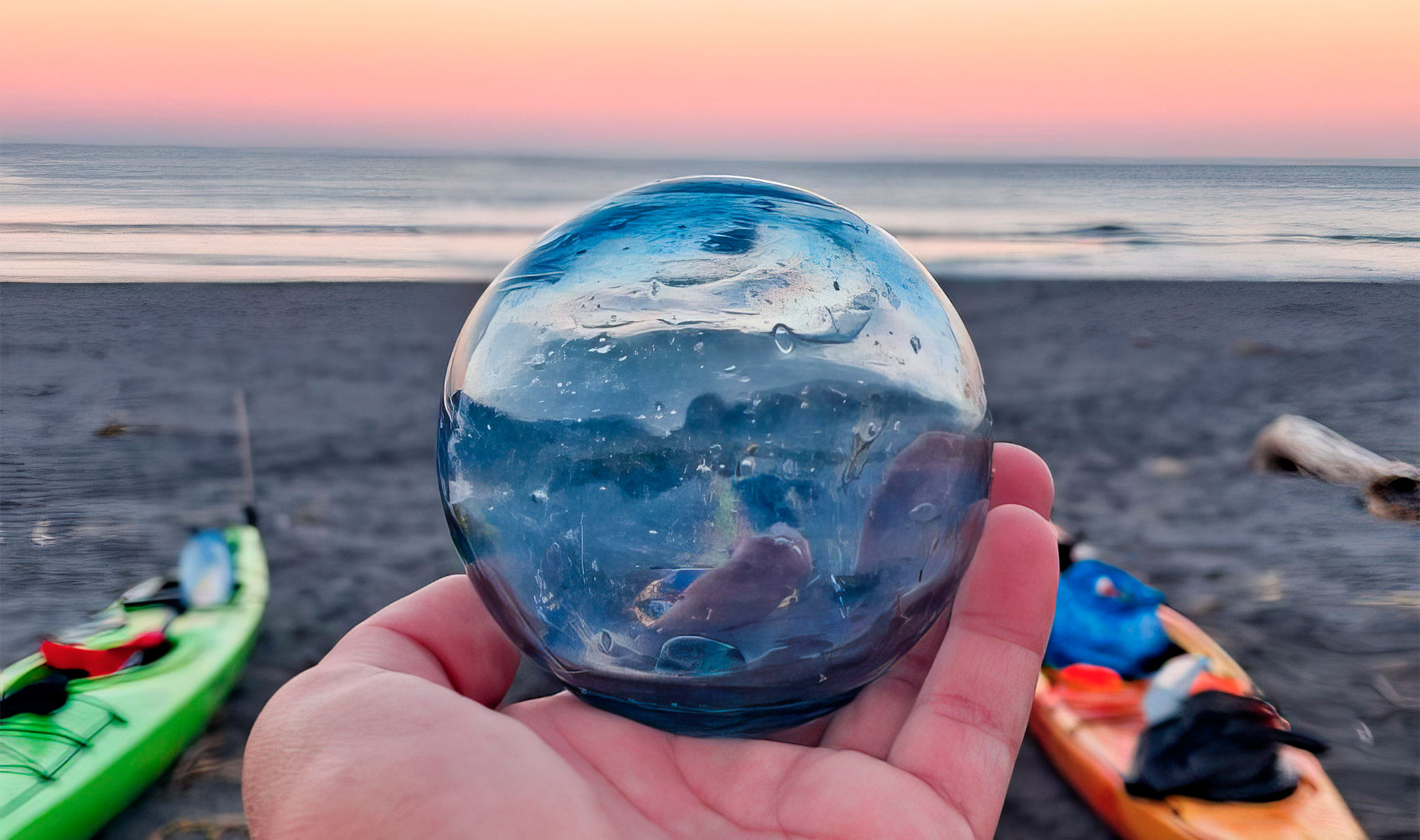 Самый необычный и довольно редкий подарок — стеклянный поплавок, кухтыль. Это наследие японской рыболовной промышленности. Такие поплавки делали для сетей до массового использования пластика, а теперь они дрейфуют по океану, и волны периодически выбрасывают их на песчаные пляжи. На некоторых экземплярах даже сохранилось японское клеймо.