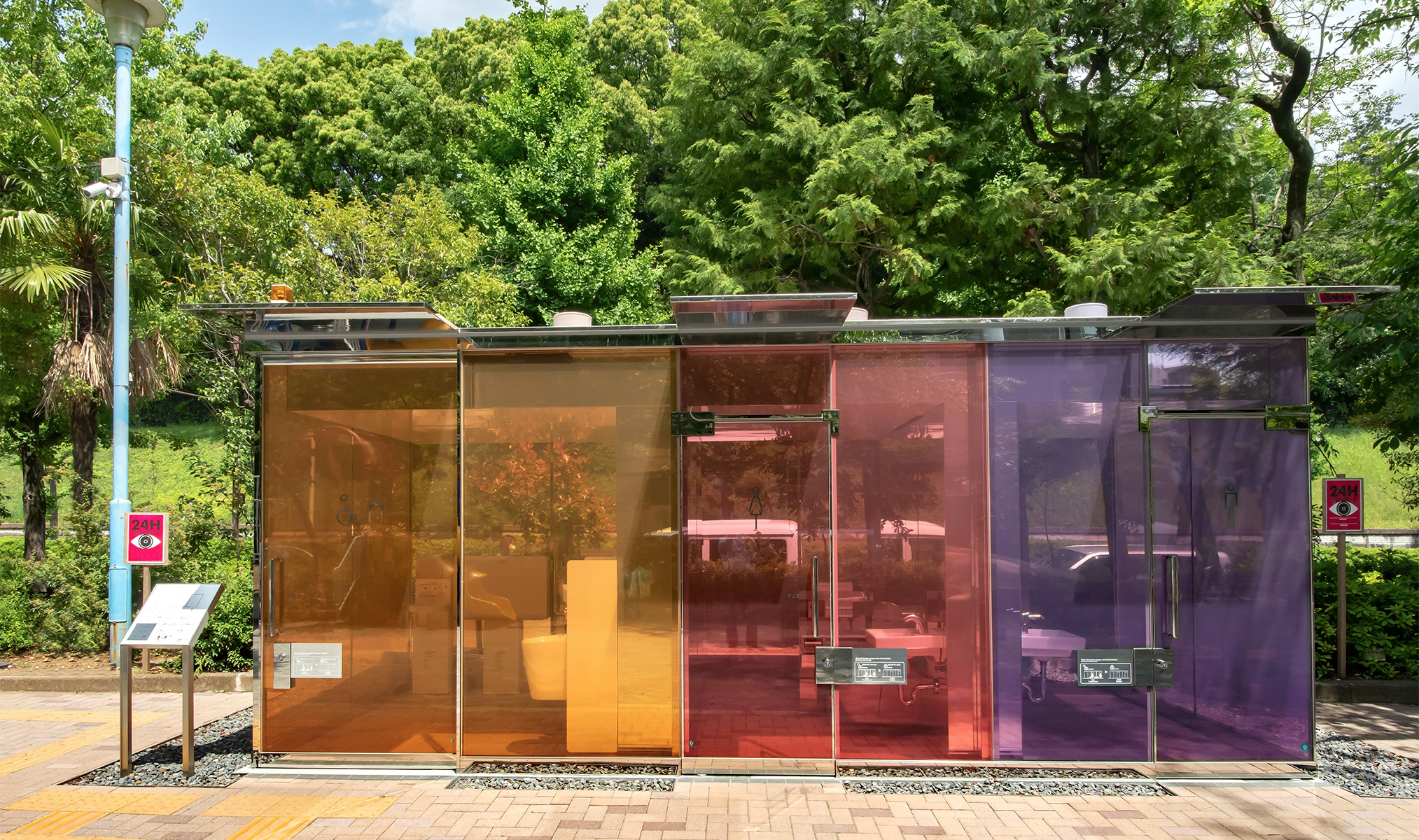 Обычно общественных уборных боятся из-за неизвестности, потому что непонятно, есть ли кто-то внутри и что там происходит. Здесь возможную тревогу просто убрали: подходишь и сразу видишь, что всё чисто и кабинка пустая. А ночью ещё и красиво парк подсвечивает!
